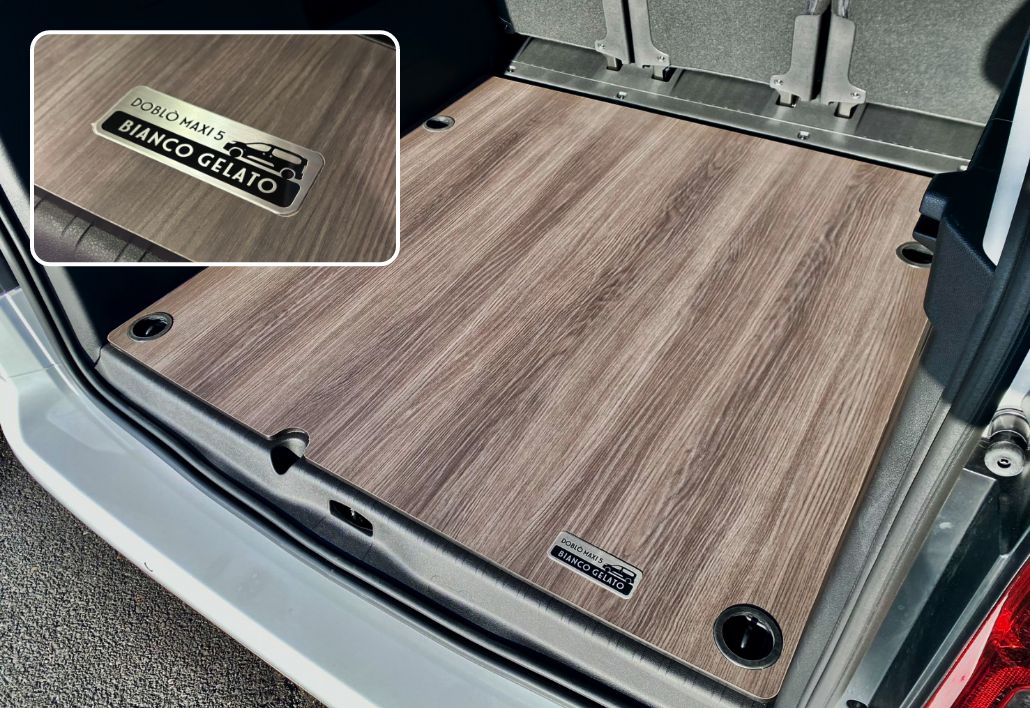 名門キャンピングカービルダー設計の専用 ラゲッジ フロアボード(ロゴ入りメタルプレート付)を搭載。また、75リットルの容量を誇る